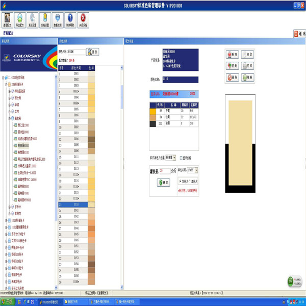 产品说明:本公司调色配方软件,是基于本公司的色浆体系开发的。适用于使用我们公司色浆的用户。目前支持市面上所有主流涂料色卡(26本)包括立邦、多乐士、华润、嘉宝莉等等。软件的特点:配方实用性强。通过本公司技术人员的大量实践和不断修改完善,配方数据更加合理,充分兼顾调色的经济性和准确性,并且给出客户明确的内外墙配方软件,减少客户因为不熟悉色浆性能,而造成的配方选择不当等问题,极大的方便客户使用。软件能提供调色价格查询功能,方便客户做调色预算,可以设定预期利润,方面客户开展工作。软件目前提供免费试用。